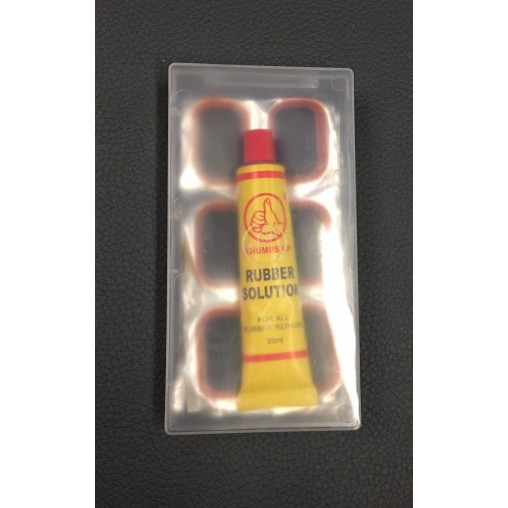 The kit includes: 12 small rectangular patches, 6 big rectangular patches, 6 small round patches, glue and scraper.